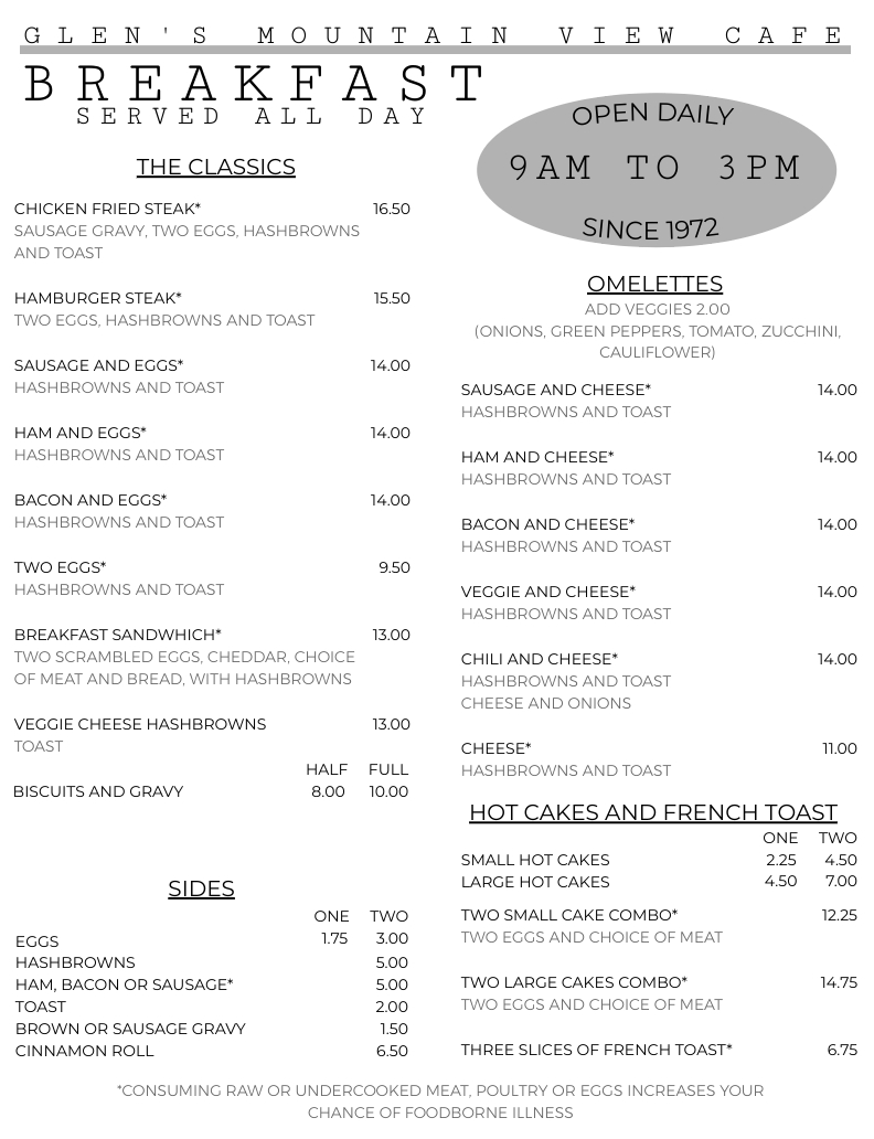 Welcome to Glen's Cafe, a local gem nestled in Florence, Montana. Located at 157 Long Ave, this quaint diner is renowned for its hearty home-cooked meals, offering a menu that features a delightful array of choices. From the crispy Fish and Chips ($5.00) to the much-celebrated Famous Yellowstone Salisbury Steak ($14.00), every dish is prepared with fresh ingredients and care.